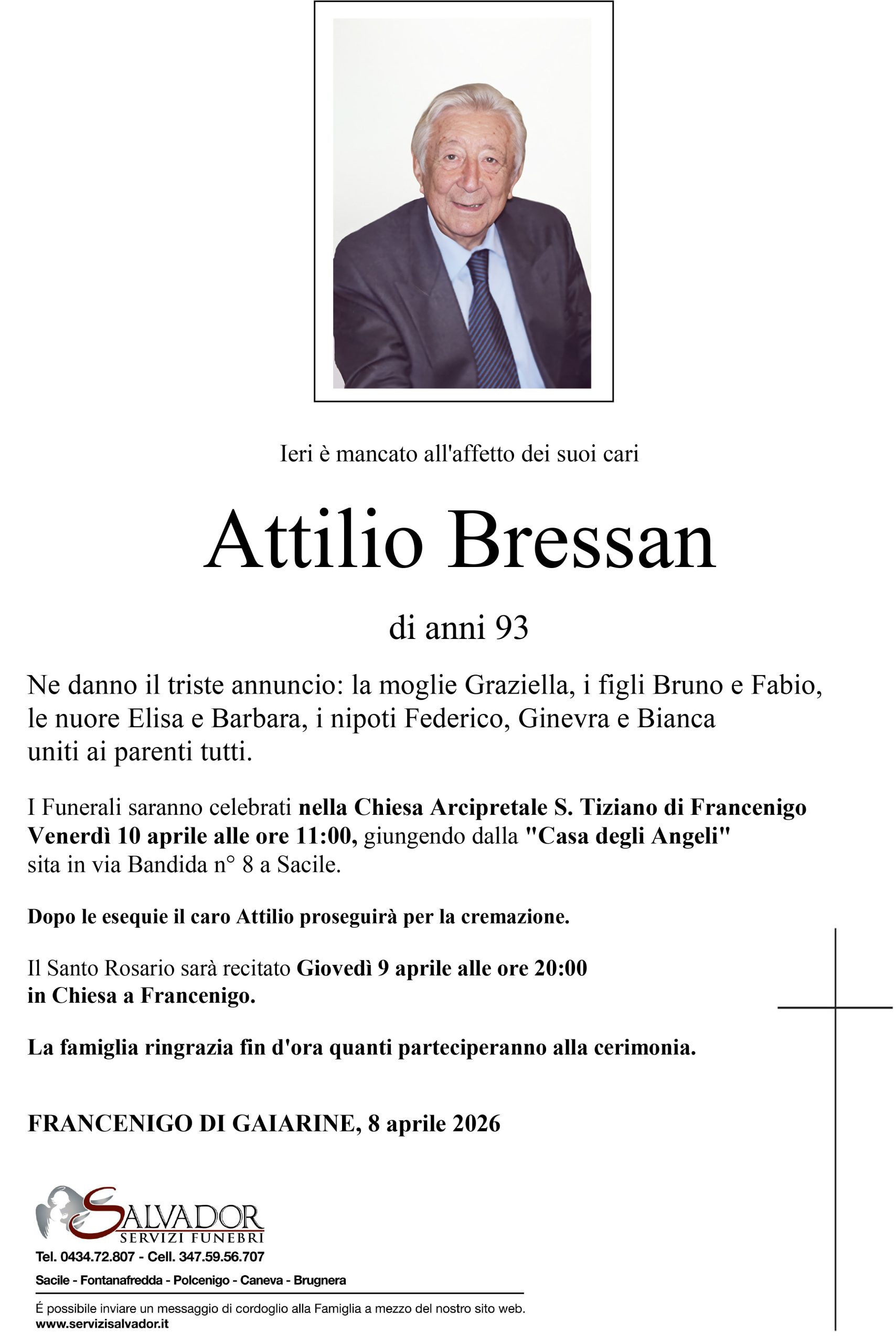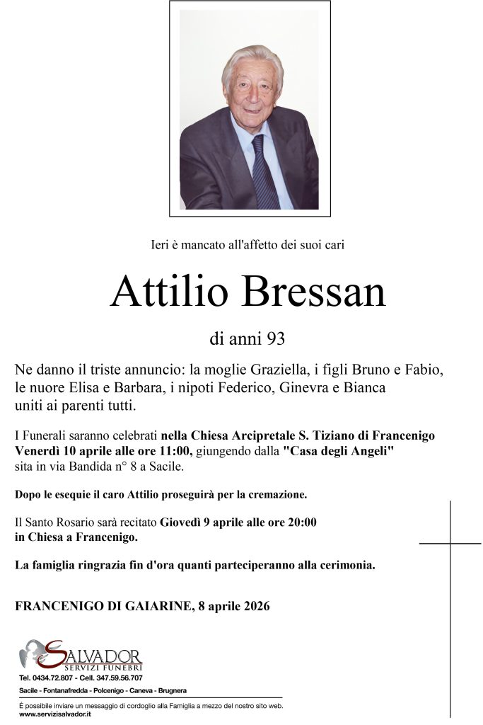 Compila i campi sottostanti e invia il messaggio di cordoglio per Attilio Bressan.