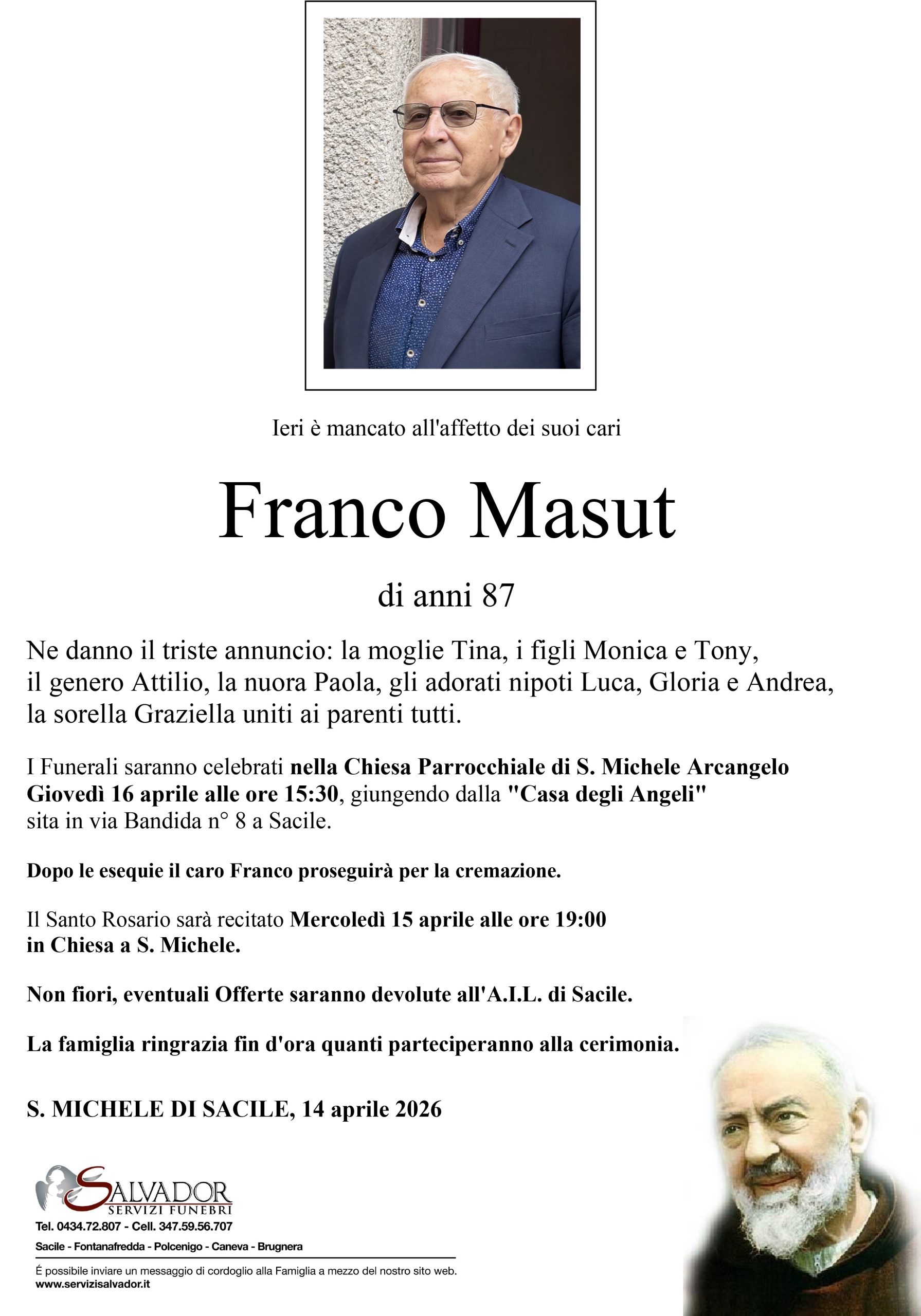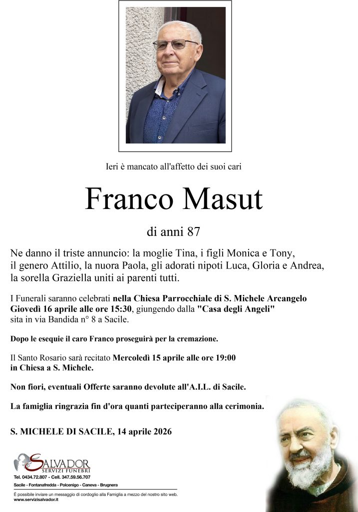 Compila i campi sottostanti e invia il messaggio di cordoglio per Franco Masut.