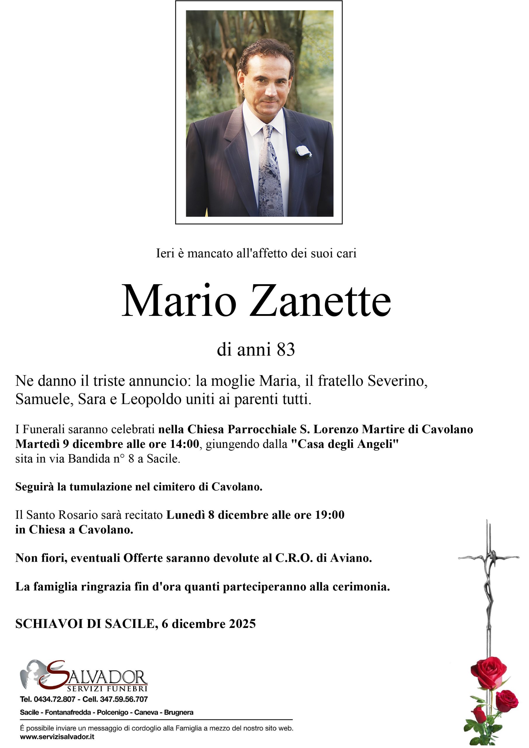 Compila i campi sottostanti e invia il messaggio di cordoglio per Mario Zanette.