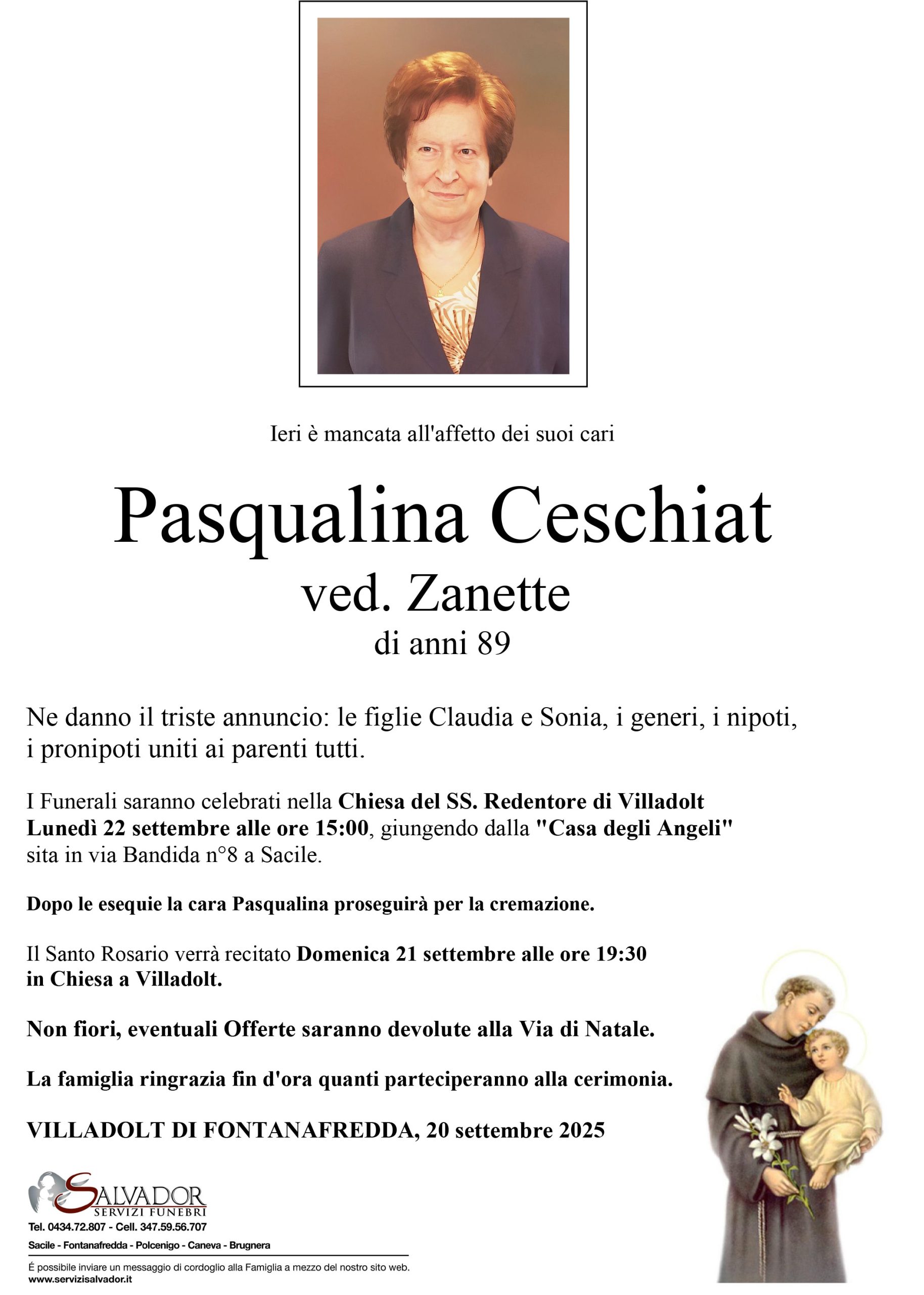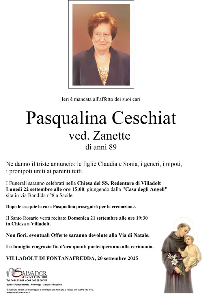 Compila i campi sottostanti e invia il messaggio di cordoglio per Pasqualina Ceschiat.