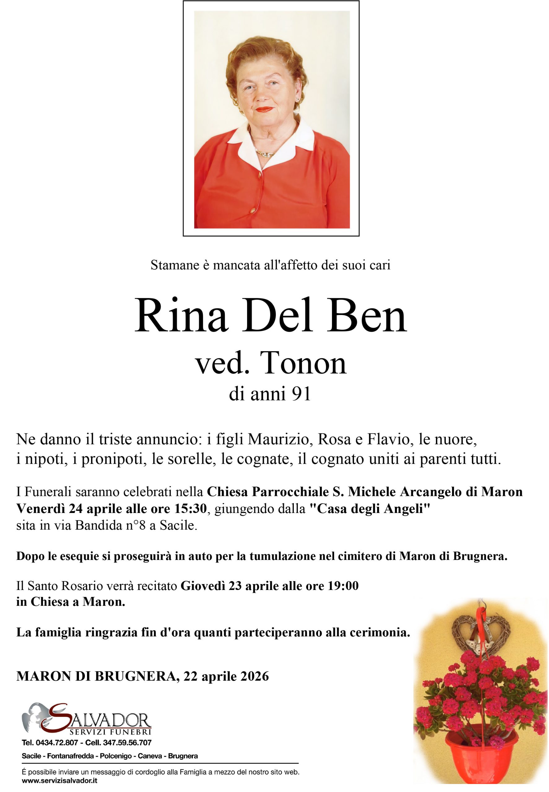 Compila i campi sottostanti e invia il messaggio di cordoglio per Rina Del Ben.