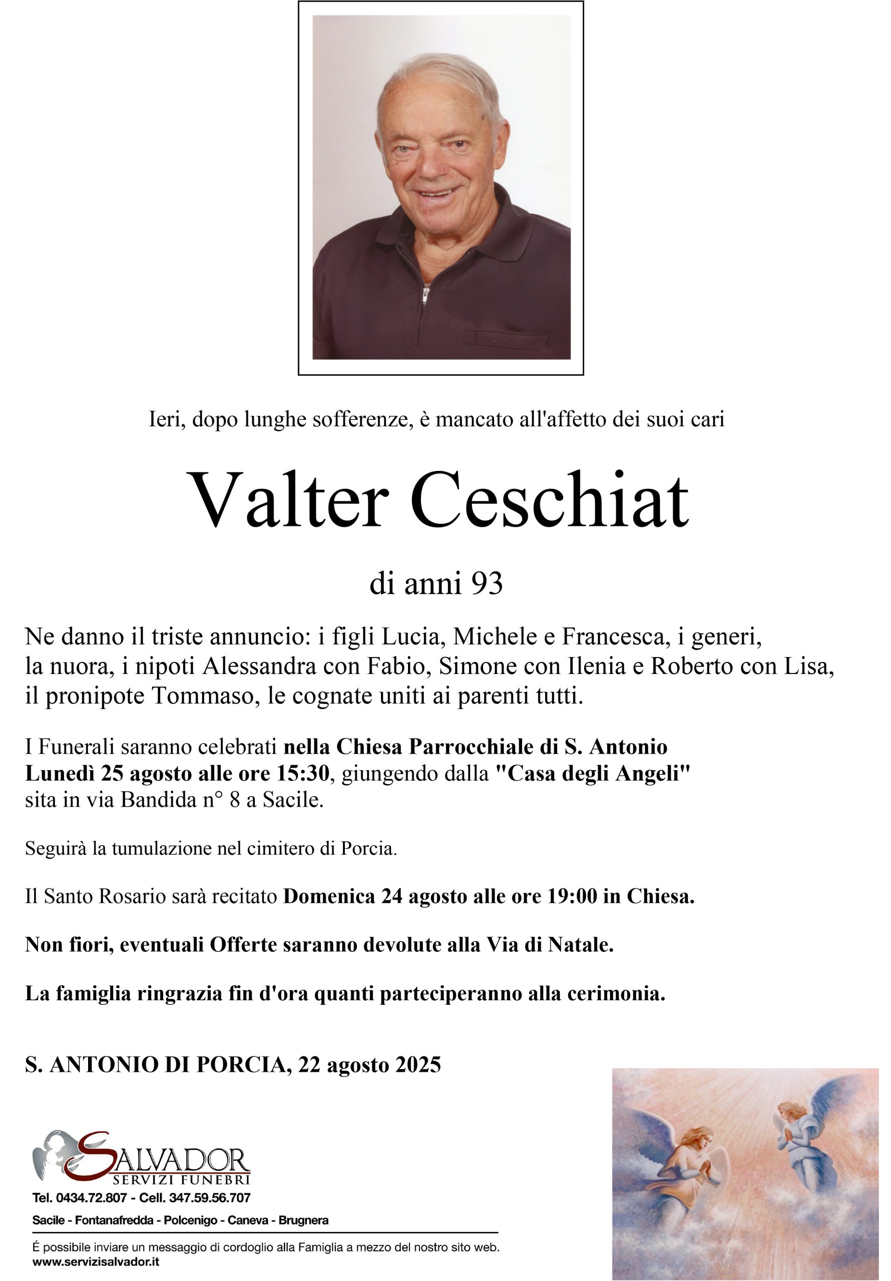 Compila i campi sottostanti e invia il messaggio di cordoglio per Valter Ceschiat.
